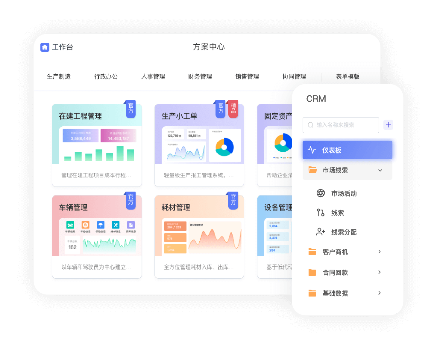 乐高里有现成的方块、轮子、小人这些“零件”,低代码平台里就有现成的“功能模块”——比如数据收集用的表单、跨部门协作的流程审批、数据可视化的报表、客户信息管理的CRM模块等等。这些模块都是平台技术团队提前开发并测试好的,稳定性有保障,不用你从零开始写一行行代码,也不用关心底层技术逻辑。