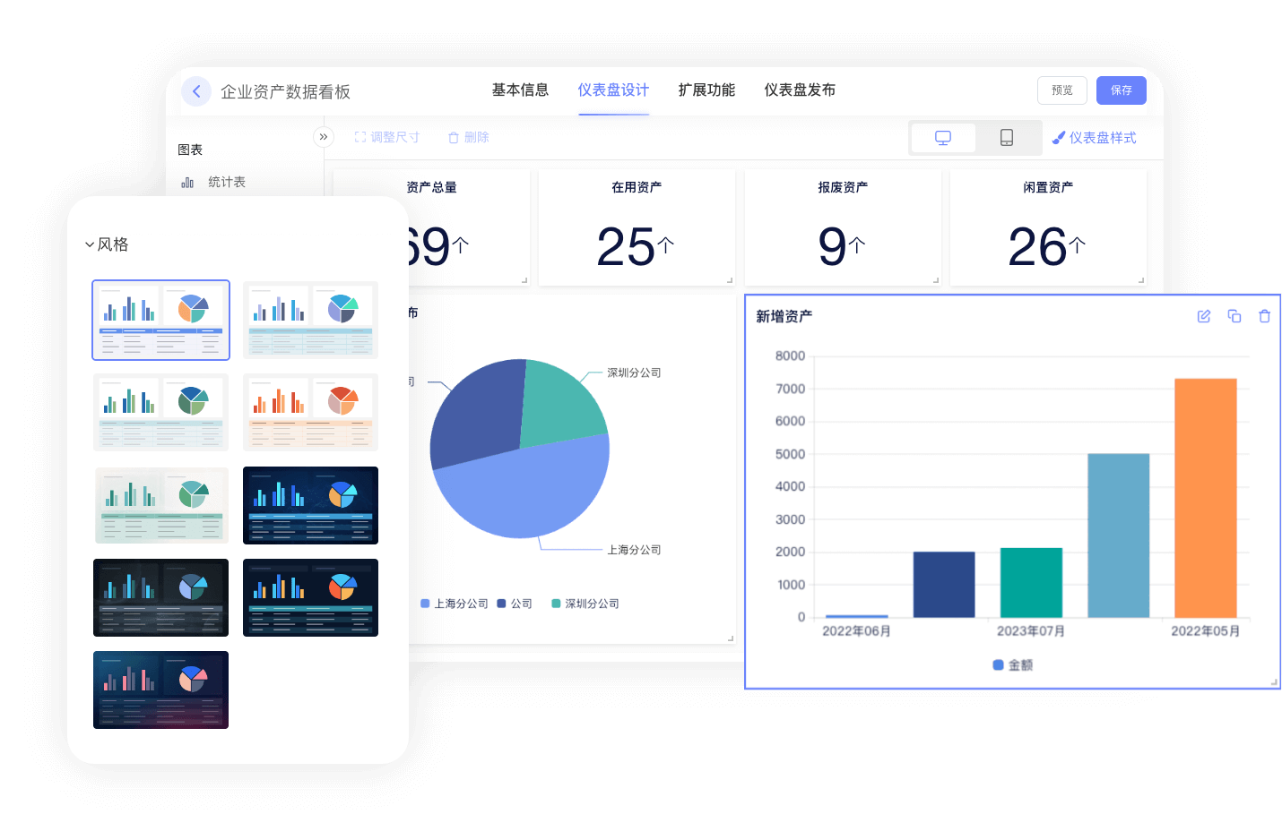 仪表盘能将数据指标以柱状图、折线图、饼图等形式可视化展示。在设备管理系统中,可展示设备总数、各状态设备数量、部门设备分布等信息,且图表实时更新,数据变化即时呈现。